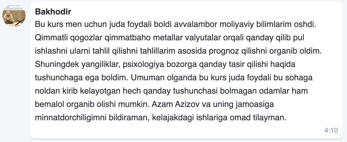 Bu kurs men uchun juda foydali boldi avvalambor moliyaviy bilimlarim oshdi. Qimmatli qogozlar qimmatbaho metallar valyutalar orqali qanday qilib pul ishlashni ularni tahlil qilishni tahlillarim asosida prognoz qilishni organib oldim. Shuningdek yangiliklar, psixologiya bozorga qanday tasir qilishi haqida tushunchaga ega boldim. Umuman olganda bu kurs juda foydali bu sohaga noldan kirib kelayotgan hech qanday tushunchasi bolmagan odamlar ham bemalol organib olishi mumkin. Azam Azizov va uning jamoasiga minnatdorchiligimni bildiraman, kelajakdagi ishlariga omad tilayman.