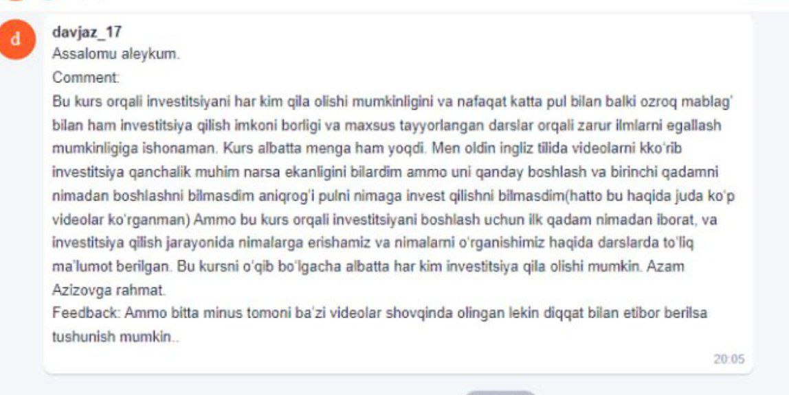 Bu kurs orqali investitsiyani har kim qila olishi mumkinligini va nafaqat katta pul bilan balki ozroq mablag' bilan ham investitsiya qilish imkoni borligi va maxsus tayorlangan darslar orqali zarur ilmlarni egallash mumkinligiga ishonaman. Kurs albatta menga ham yoqdi. Men oldin ingliz tilida videolarni kko'rib investitsiya qanchalik muhim narsa ekanligini bilardim ammo uni qanday boshlash va birinchi qadamni nimadan boshlashni bilmasdim aniqrogi pulni nimaga invest qilishni bilmasdim(hatto bu haqida juda ko'p videolar ko'rganman) Ammo bu kurs orqali investitsiyani boshlash uchun ilk qadam nimadan iborat, va investitsiya qilish jarayonida nimalarga erishamiz va nimalarni o'rganishimiz haqida darslarda to'liq ma'lumot berilgan. Bu kursni o'qib bo'lgacha albatta har kim investitsiya qila olishi mumkin. Azam Azizovga rahmat.