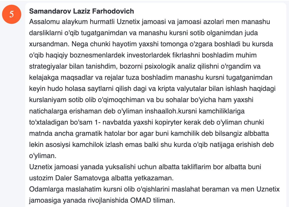 Assalomu alaykum hurmatli Uznetix jamoasi va jamoasi azolari men manashu darsliklarni o'qib tugatganimdan va manashu kursni sotib olganimdan juda xursandman. Nega chunki hayotim yaxshi tomonga o'zgara boshladi bu kursda o'qib haqiqiy boznemenlardek investorlar dek fikrlashni boshladim muhim strategiyalar bilan tanishdim, bozorni psixologik analiz qilishni o'rgandim va kelajakka maqsadlar va rejalar tuza boshladim manashu kursni tugatganimdan keyin hudo holasa saytlarni qilish dagi va kripta valyutalar bilan ishlash haqidagi kurslarniyam sotib olib o'qimoqchiman va bu sohalar bo'yicha ham yaxshi natichalarga erishaman deb o'yliman inshaalloh.kursni kamchiliklariga to'xtaladigan bo'sam 1- navbatda yaxshi kopiryter kerak deb o'yliman chunki matnda ancha gramatik hatolar bor agar buni kamchilik deb bilsangiz albatta lekin asosiysi kamchilik izlash emas balki shu kurda o'qib natijaga erishish deb o'yliman.