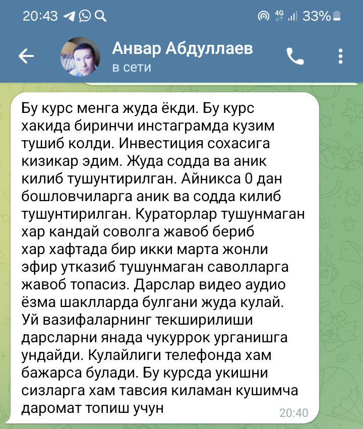 Бу курс менга жуда ёкди. Бу курс хакида биринчи инстаграмда кузим тушиб колди. Инвестиция сохасига кизикар эдим. Жуда содда ва аник килиб тушунтирилган. Айникса 0 дан бошловчиларга аник ва содда килиб тушунтирилган. Кураторлар тушунмаган хар кандай соволга жавоб бериб хар хафтада бир икки марта жонли эфир утказиб тушунмаган саволларга жавоб топасиз. Дарслар видео аудио ёзма шаклларда булгани жуда кулай. Уй вазифаларининг текширилиши дарсларни янада чукуррок урганишга ундайди. Кулайлиги телефонда хам бажарса булади. Бу курсда укишни сизларга хам тавсия киламан кушимча даромат топиш учун